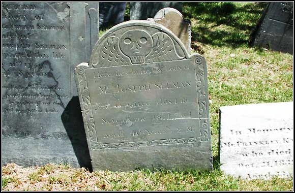 Most common is the skull with wings. Older gravestones have the skull with hallowed out eyes and rows of teeth, some had wings and some had crossbones, while younger gravestones are more angel-like. The skull symbolizes death, while the wings symbolize the soul's migration or the soul leaving the body.